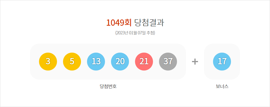 1049회 로또 당첨 번호 : 3, 5, 13, 20, 21, 37 보너스 번호 17
