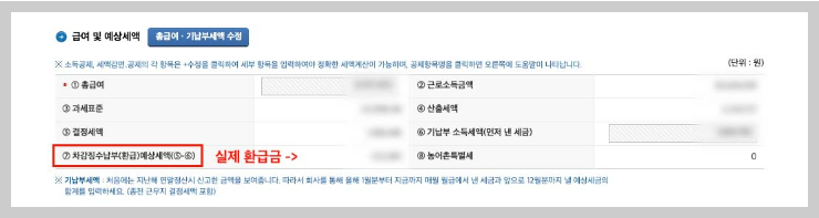 여기서 7번인 차감징수 납부 (환급) 예상세액이 바로 여러분이 연말정산으로 돌려받을 수 있는 실제 환급금 금액입니다.