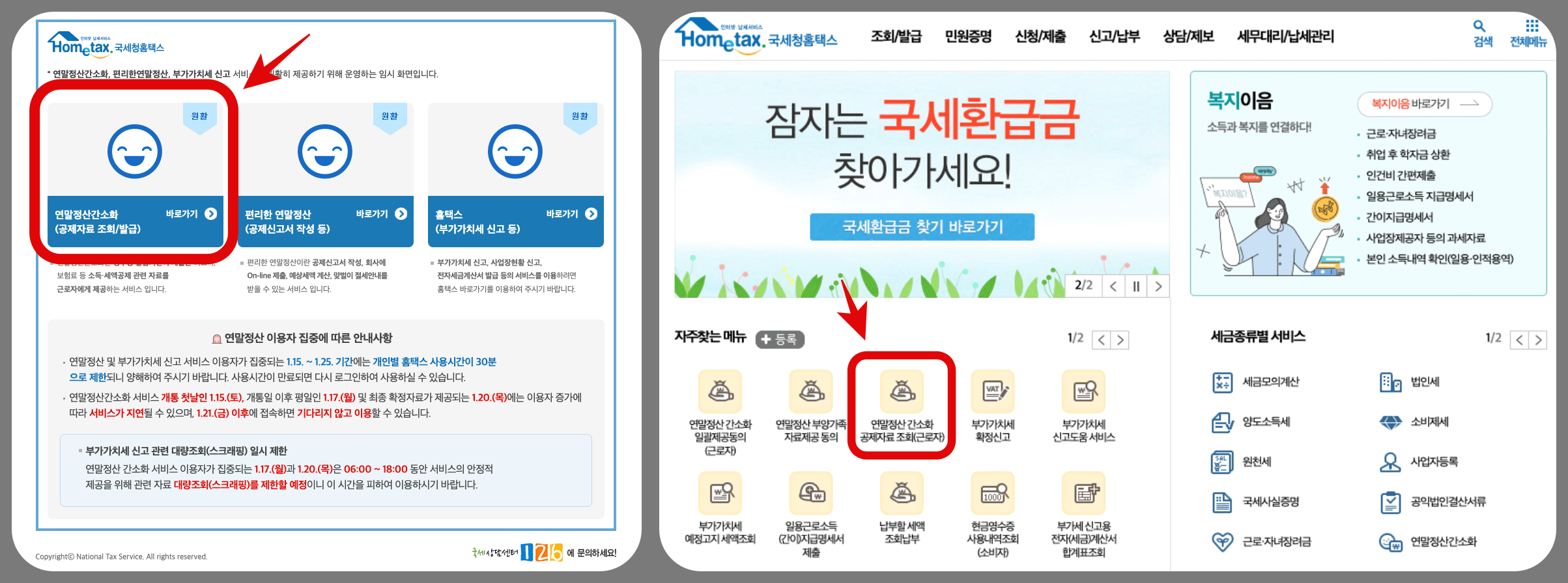 연말정산 간소화 서비스는 저희가 지금까지 연간 소득 관련 사용한 모든 내역들을 국세청에서 운영하는 "홈택스" 일명 손택 스라고도 불리는 홈페이지에서 내역들을 확인하고 간소화된 자료들을 받을 수 있는 서비스를 말합니다.