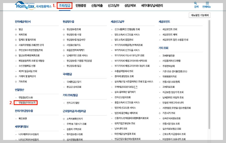 - 상단 메뉴 ► 조회/발급 ► 연말정산 미리보기