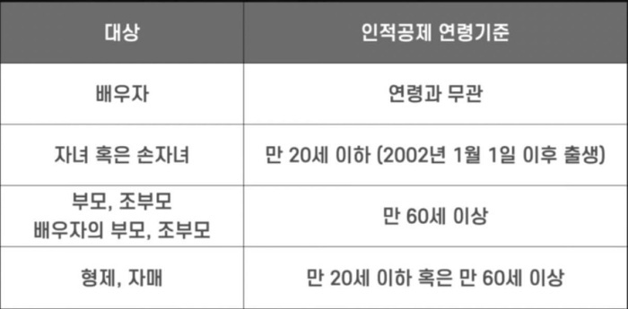 - 자녀 혹은 손자녀>만 20세 이하 (2002년 1월 1일 이후 출생)