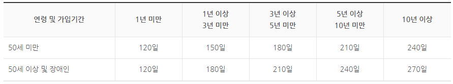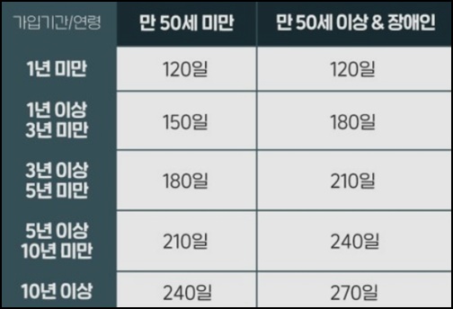 - 연령, 장애 여부 및 고용보험 가입 기간에 따라 120일부터 270일까지 지급