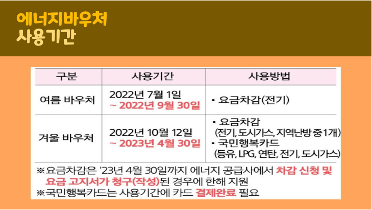 겨울 에너지 바우처 사용기간은 2022. 10. 12. ~ 2023. 4. 30.까지 입니다. 에너지 바우처 사용방법은 요금차감방법과 국민행복카드 결제 방법이 있습니다.