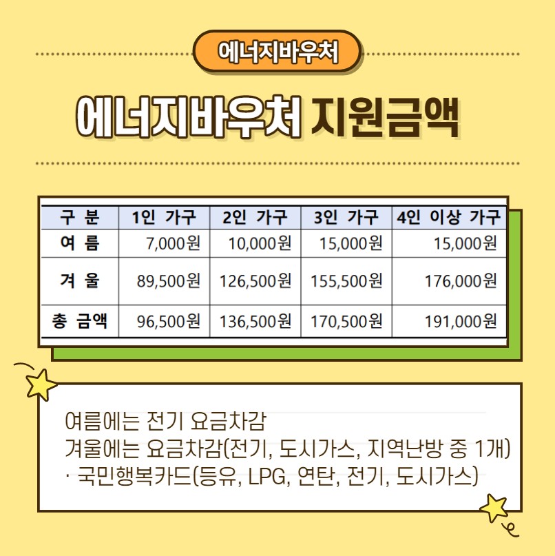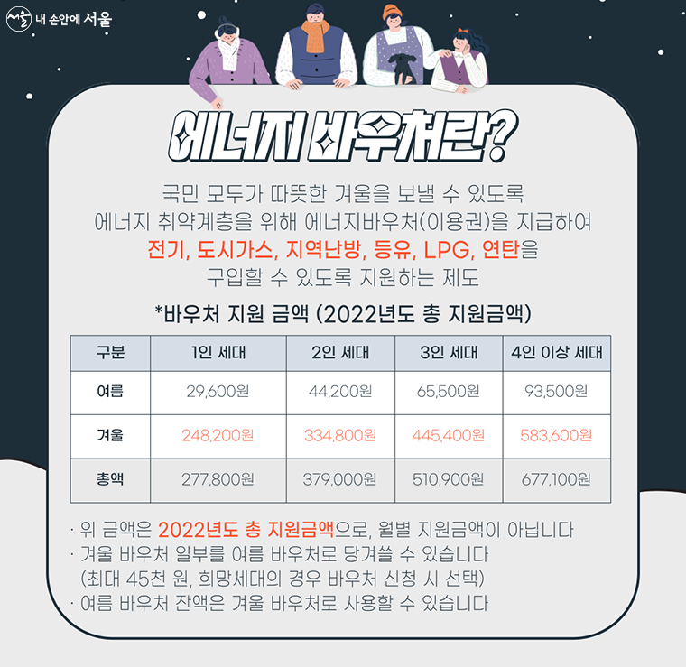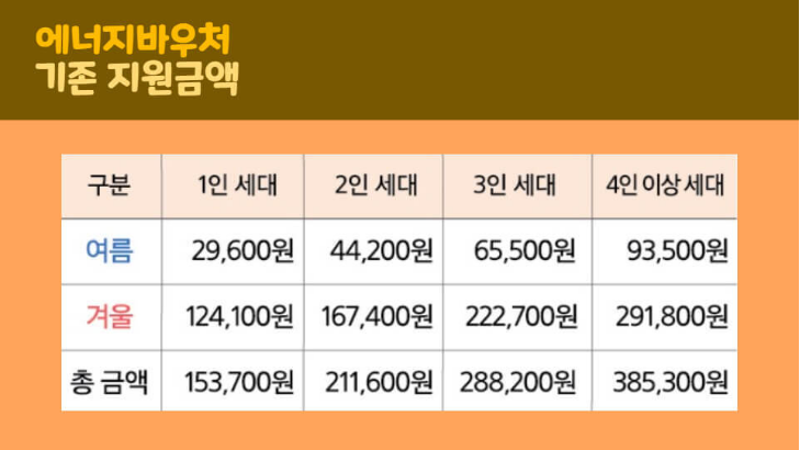 이번 겨울 에너지 바우처의 금액은 1인가구의 경우 248,200원, 2인 가구 334,800원, 3인 가구 445,400원, 4인 가구 583,600원으로 기존 금액에서 2배로 인상지원됩니다