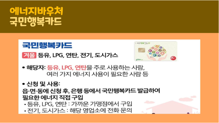국민행복카드 결제의 경우 등유, LPG, 연탄을 주로 사용하거나, 여러가지 에너지를 사용하는 분이 선택하는 사용방법입니다. 읍면동 행정복지센터에서 에너지바우처를 신청 한 후 은행에서 국민행복카드를 발급하면 됩니다. 카드 발급 후에는 필요한 에너지를 직접 구매 후 결제하면 됩니다.