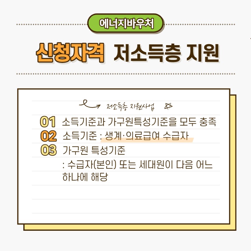 에너지 바우처를 신청하기 위해서는 2가지 기준을 충족해야 합니다. 바로 소득기준과 세대원 특성기준입니다.