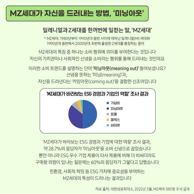 3) MZ세대는 미닝아웃 즉 자신의 신념을 표출하고, 사회적 가치나 특별한 메세지를 담은 물건을 구매합니다.